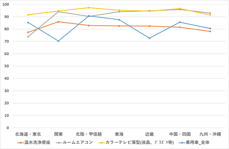 耐久消費財の普及率を地域ブロック別に比較してみます。