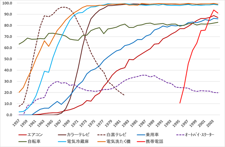 耐久消費財の普及率の推移を実際のデータで見てみます。内閣府の「消費動向調査」は毎月「消費者マインド」の調査をしていますが、年1回、3月には、実際の耐久消費財の普及動向を調査しています。1957年から2004年までの調査対象となった幾つかの耐久消費財の長期的な普及率の推移を見てみましょう。この時代に生きていた人達の経験のデータでの確認とも言えます(図3)。