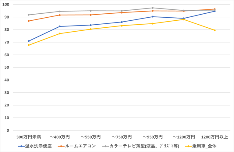 また、新たな耐久消費財は、新たな技術に基づく製品として市場に出ますが、それを取得・保有するか否かは、各家計の予算制約下での選択(当該耐久消費財の直接的効用のみならず、社会心理的要因も含めた選択)の結果によります。従って、調査対象となる世帯の年間収入階層別の普及率を観察すると一定の傾向が確認出来ます。