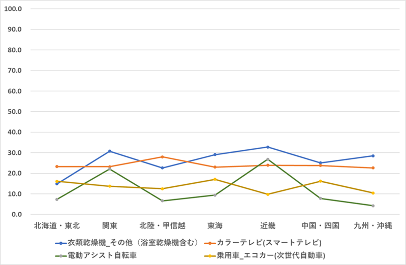 これに比べて、普及率が未だ高くない耐久消費財、衣類乾燥機、スマートテレビ、エコカー、電動アシスト自転車では、地域間の普及率の相対的な相違が普及率の高い耐久消費財と比べて大きい事が分かります(図5)。