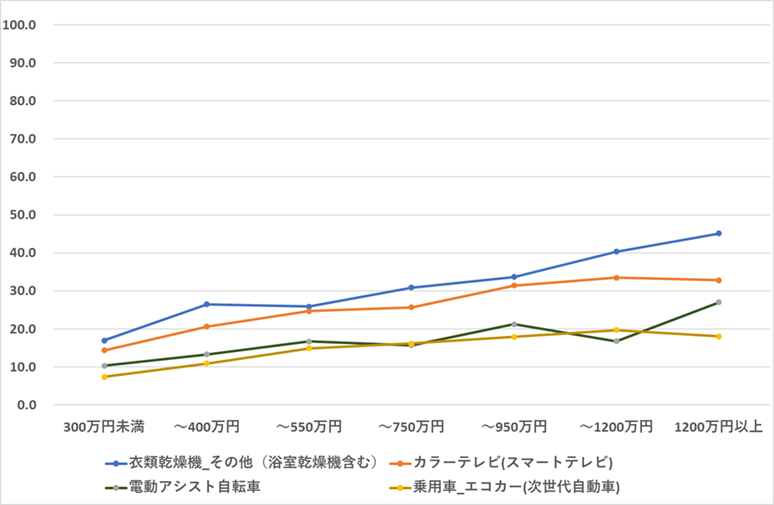 これに比して、普及率が未だ高くない耐久消費財、衣類乾燥機、スマートテレビ、エコカー、電動アシスト自転車では、年収階層間の普及率の相対的な相違が普及率の高い消費財と比べて大きい事が分かります(図7)。