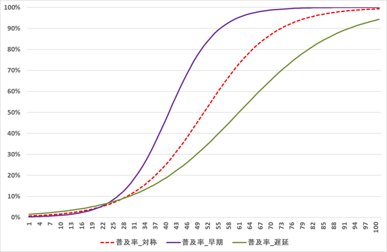 逆に、「はじめの普及はゆっくりで、普及率上限 a になるまでの時間の1/2よりも遅れて『変局点』に到達する」(グラフ右側の緑の線)というという場合もあります。