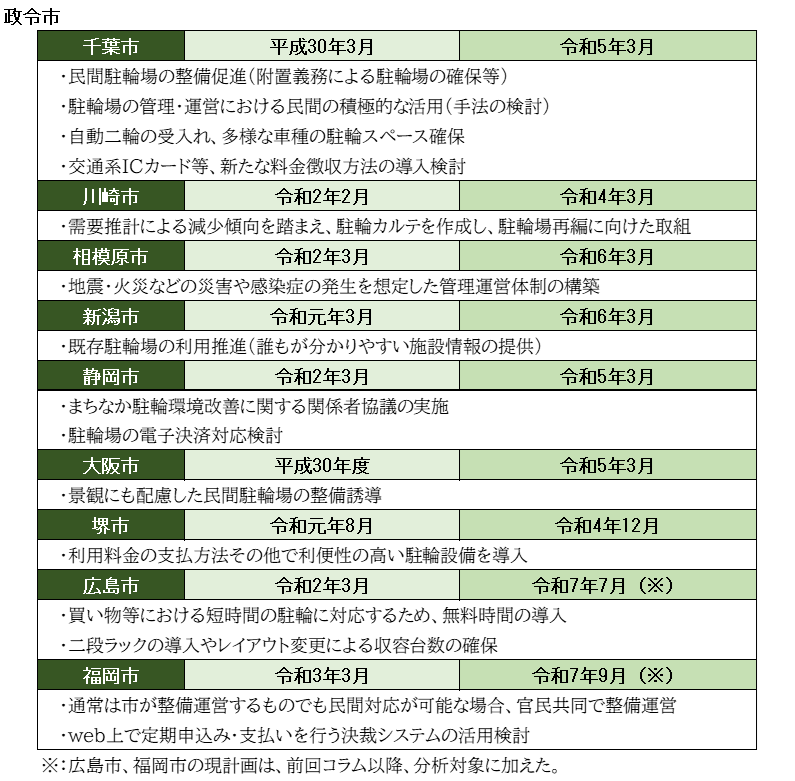 政令市においては9自治体が計画変更していますが、その中では新たな駐輪ニーズとして、ICTを活用した料金支払い方法を挙げる自治体(千葉市、静岡市、堺市、福岡市)や、民間の積極活用を挙げる自治体(千葉市、大阪市、福岡市)が目立ちます。ICT活用の料金支払いについては、堺市は、今回の有識者会議資料に示された自治体ヒアリング調査結果においても「機械化、キャッシュレス化のニーズが高いことから、多様な駐輪ニーズへの対応も(国の計画に)追記が必要では」と回答しています。
