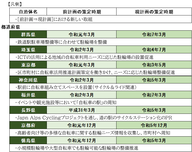 都道府県において駐輪ニーズの変更が確認されるのは、8自治体です。都道府県の役割上、駐輪ニーズに関しては市区町村への周知や働きかけが措置内容の中心であり、特徴的な新たなニーズとしては、観光政策に伴う駐輪場のPR(福井県、長野県)などがあります。東京都の現計画(令和3年5月)においては、区市町村に自転車活用推進計画策定を働きかけ、ニーズに応じた駐輪場整備を促進する旨の記載があり、同計画以前は23区の中で1自治体しか計画策定されていませんでしたが、現在は19自治体で策定されています。