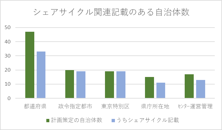 シェアサイクルについては、すでに現行計画においても普及促進のための複数の措置が位置付けられているとともに進捗状況を評価する指標として「シェアサイクル事業が位置付けられた自転車活用推進計画を策定した市区町村数:60(令和2年度実績)→240(令和7年度)」とされており、現時点でも多くの自治体の計画にシェアサイクル関連の記載が見られます。ここでは、これまで2回のコラム(①8月21日、②9月25日)で分析対象とした118自治体(1.都道府県、2.政令指定都市、3.東京特別区、4.県庁所在地、5.センター運営・管理施設のある都市)の計画におけるシェアサイクルの記載について見てみます。1~5のいずれの自治体グループにおいても多くの自治体でシェアサイクルの記載が見られますが、特に、東京特別区(計画策定済の19自治体すべて)と政令指定都市(20自治体中、19自治体)では、計画にシェアサイクルについて記載している割合が極めて高いです。