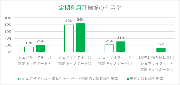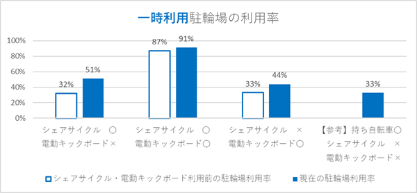 同じWEBアンケート調査結果では、シェアサイクルや電動キックボードの利用者は、それら利用開始後に新たに持ち自転車を併用する割合も高くなっています。これらの結果から、今後新たにシェアサイクルや電動キックボードを利用する者が持ち自転車を併用して、それを停めるため新たに駐輪場を利用する可能性が示されました。